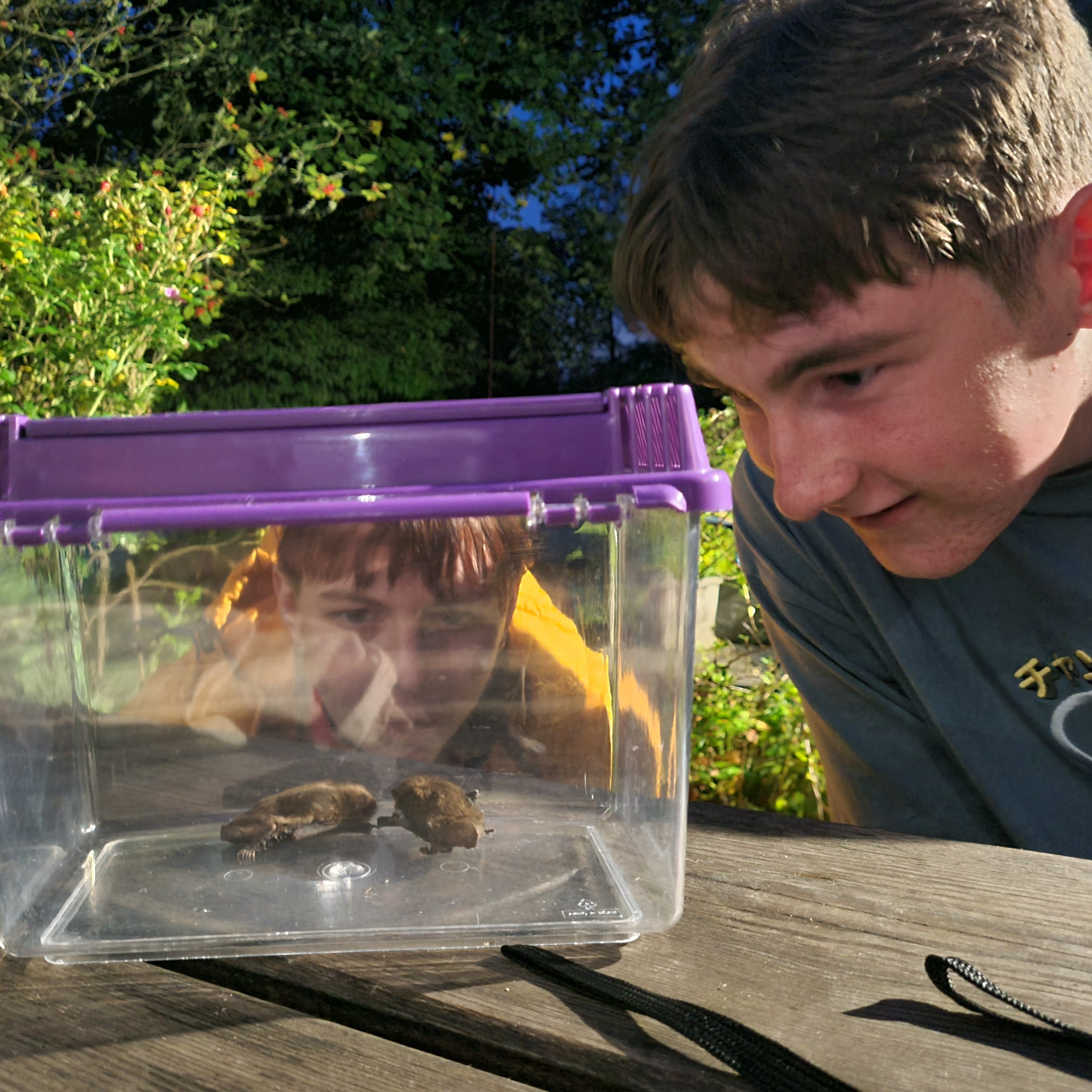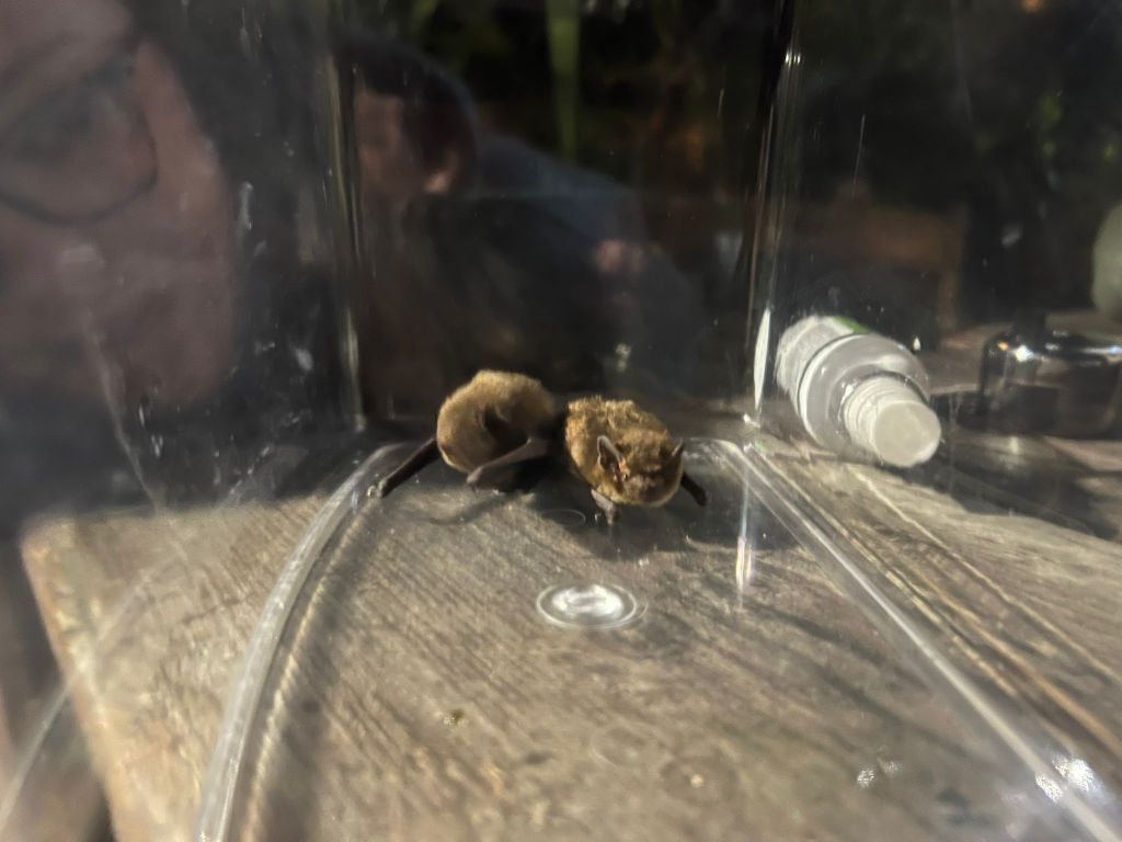Because Derek is a licenced bat handler, and he is also a bat carer, being able to rehabilitate injured bats, he is able to catch bats to show us for educational purposes. He held a net over the hole the bats were coming out and they dropped into the net as they exited. He caught two as they are very sociable animals and will be less distressed is they are together. We were able to observe the bats at close quarters in a terranium for a few minutes and noted how cute and furry they are close up. On of the NERD club members released the bats and they flew off to join the others.