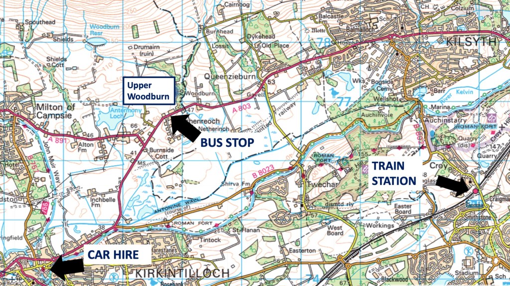 There is an excellent and good-value car rental place only a mile and a half away from Upper Woodburn which we have used many many times. AMK (North Glasgow Branch) will rent you a compact car for £38 a day or £190 for the week.