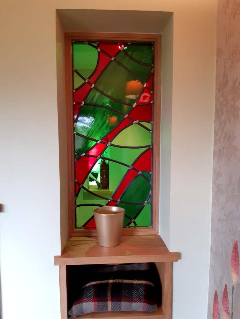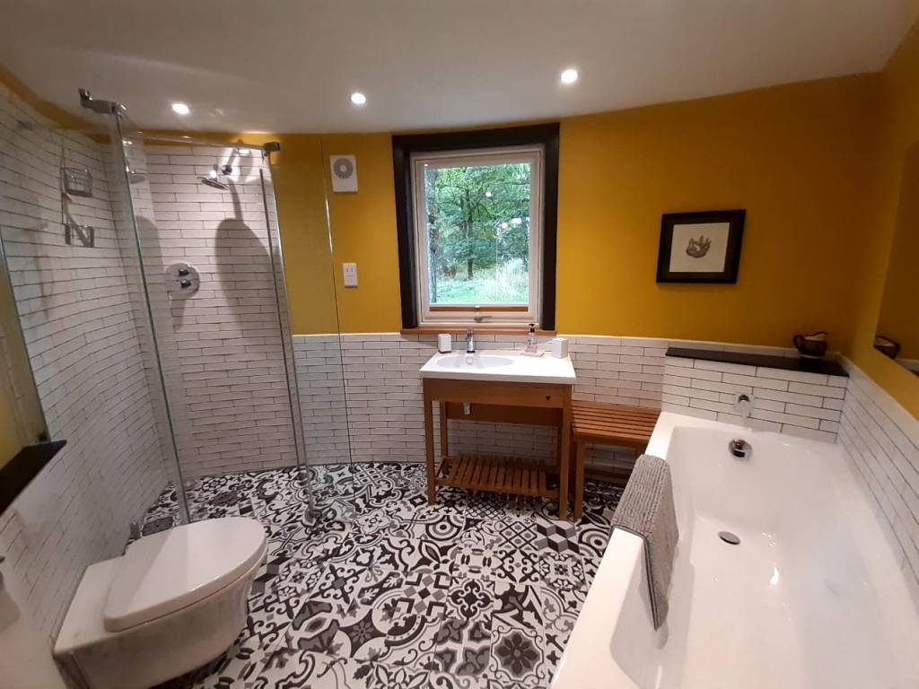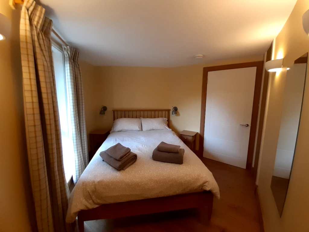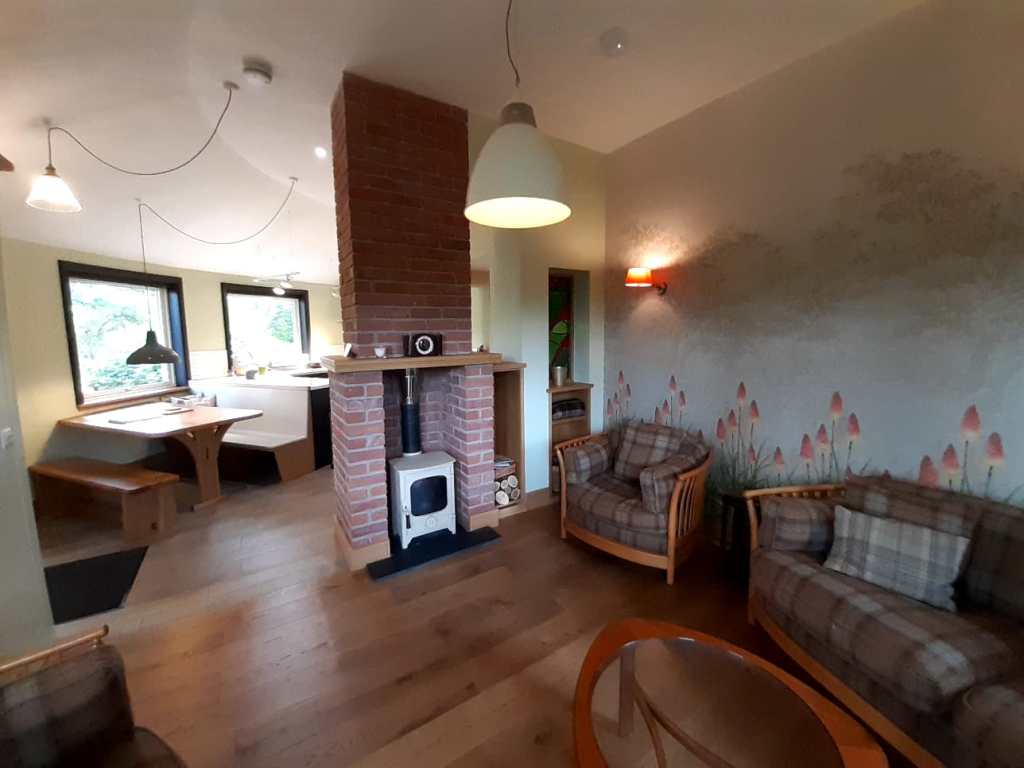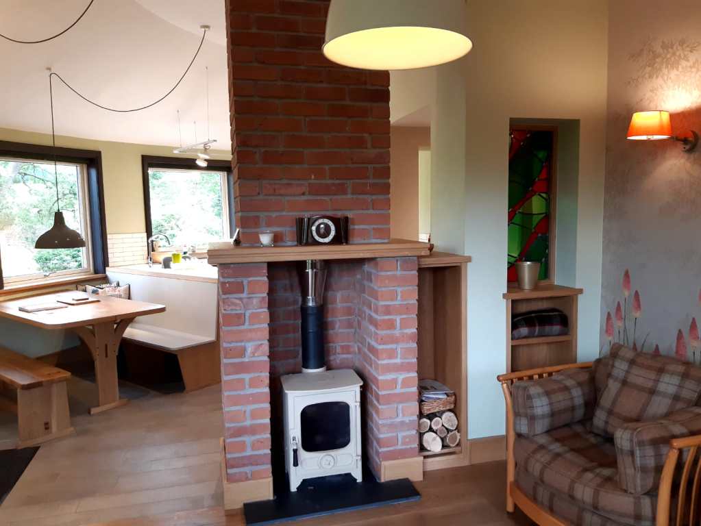 This warm, wooden and stone-clad cottage sits in beautiful gardens and woodland at the foot of the Campsie hills. The open plan living, dining, kitchen area has a central stove with brick feature wall and hand-made dining furniture. There is a double room with king size bed and a twin room. The family bathroom has a separate shower and bath. The cottage has level access and an accessible bathroom.