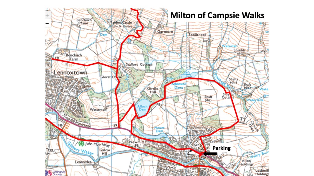 There are nice walks in the woods and round the Dams near Milton of Campsie. You can access these from the village centre, parking opposite the Fells Café. There is a signpost on the main road for the footpath. The long-distance path – The John Muir way follows the route of the Glazert water/Strathkelvin Railway Path and is a great way of joining other paths to a circular route.
